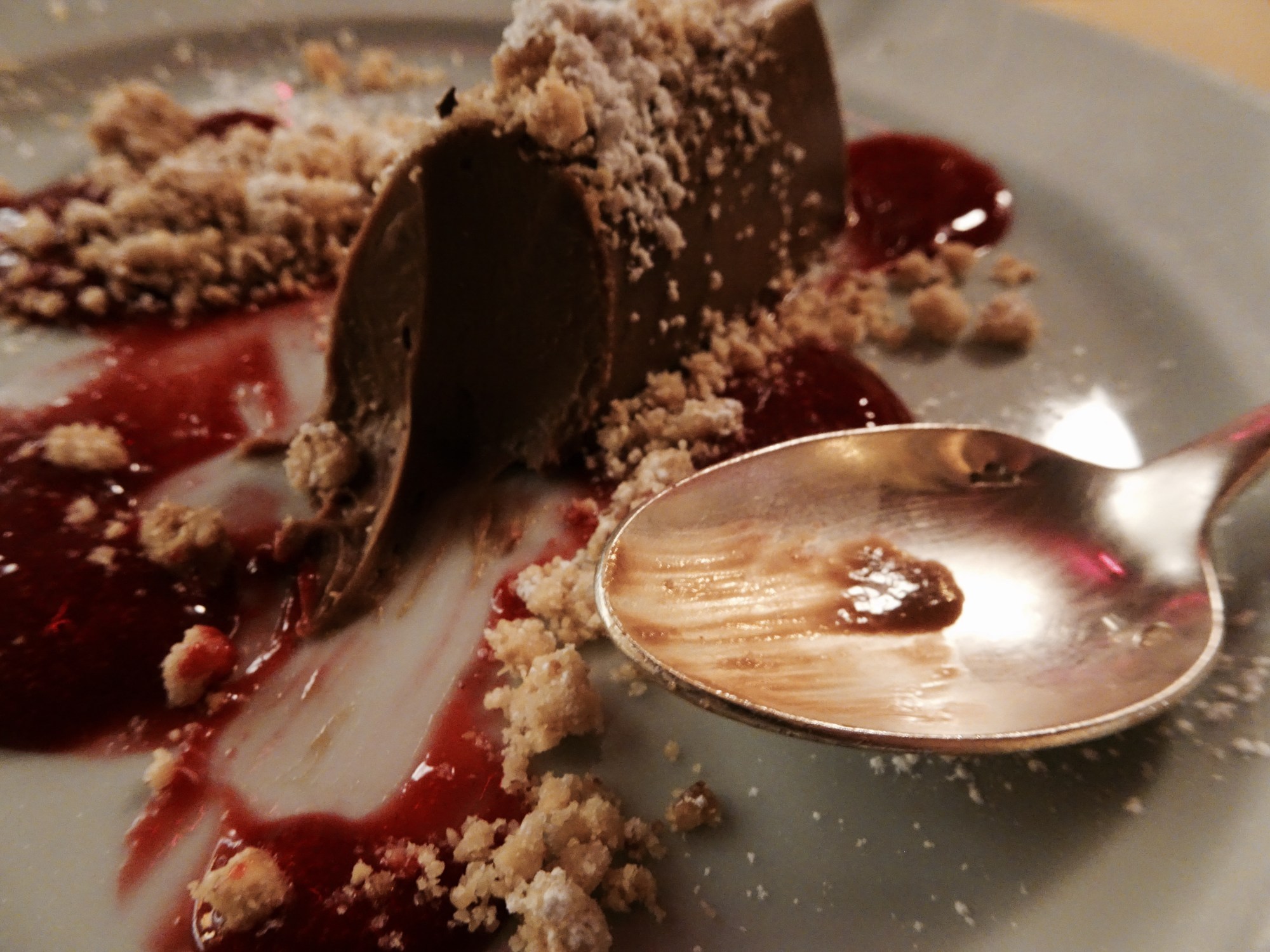 Gianduiotto, raspberry sauce and hazelnut biscuit crumble – clearly the hero shot! Gianduiotto originates in the Piedmont region and is shaped like a boat upside down – it was like a thick chocolate mousse and complimented perfectly with the syrupy raspberry sauce and the crunch of the crumble. Mouth watering!